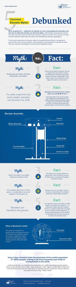 After working with elevators and elevator motors for over 30 years, Renown Electric has put together an infographic that lists common elevator myths and then debunks them— revealing the truth behind each.