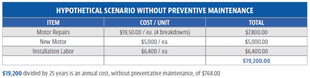 Consider our hypothetical scenario below. Assuming that unattended motors tend to break down every 4 years instead of 5, there are still four major emergency repairs scheduled over the same 25-year period — even with a new motor in the mix. These repairs will cost, on average, $750 in parts and $1,200 in labor. Over the 25-year standard lifetime, there will also be the installation of a new motor costin $11,400 and four emergency repairs totaling $7,800 — bringing our total to an additional $768 per year without preventative maintenance, or $19,200 over a 25-year period.