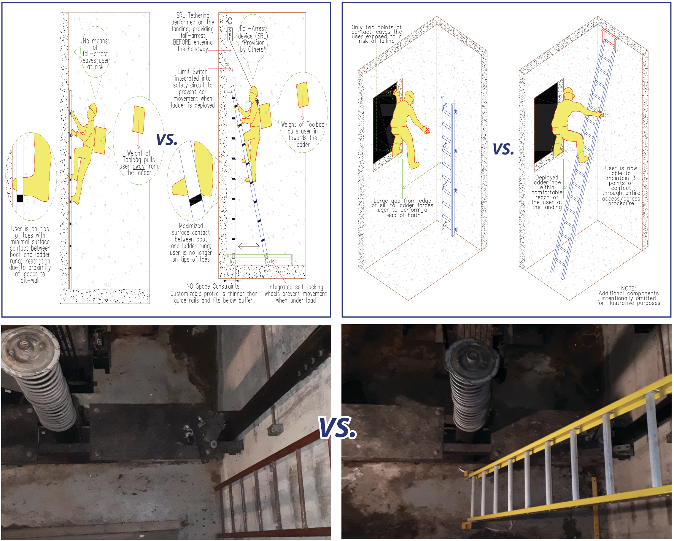 Our patent-pending retractable ladder system offers a simple, yet effective means of easing safety concerns when it comes to accessing elevator pits. This system has an enhanced level of safety that supersedes current regulatory compliances. Features include (but are not limited to):
