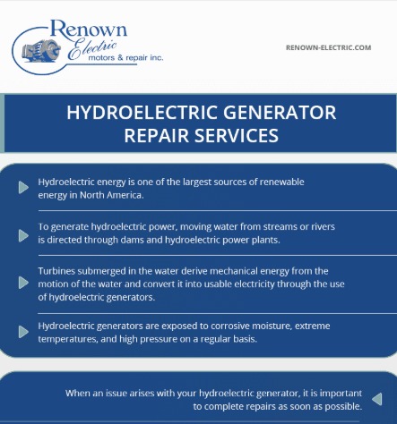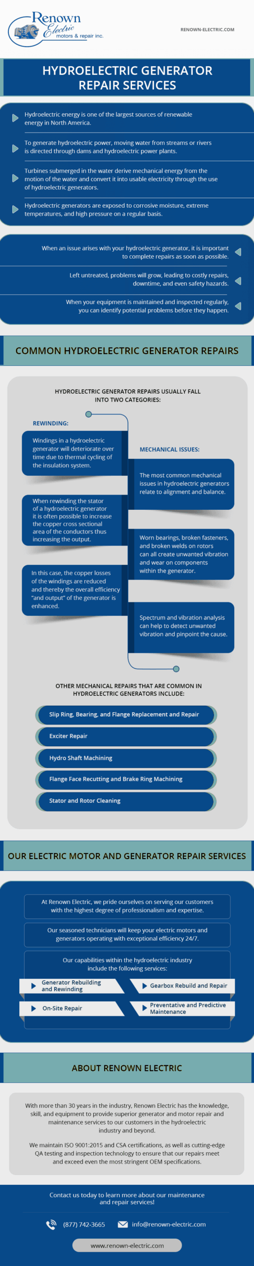 Hydroelectric generator repairs usually fall into two categories: rewinding and mechanical repairs.