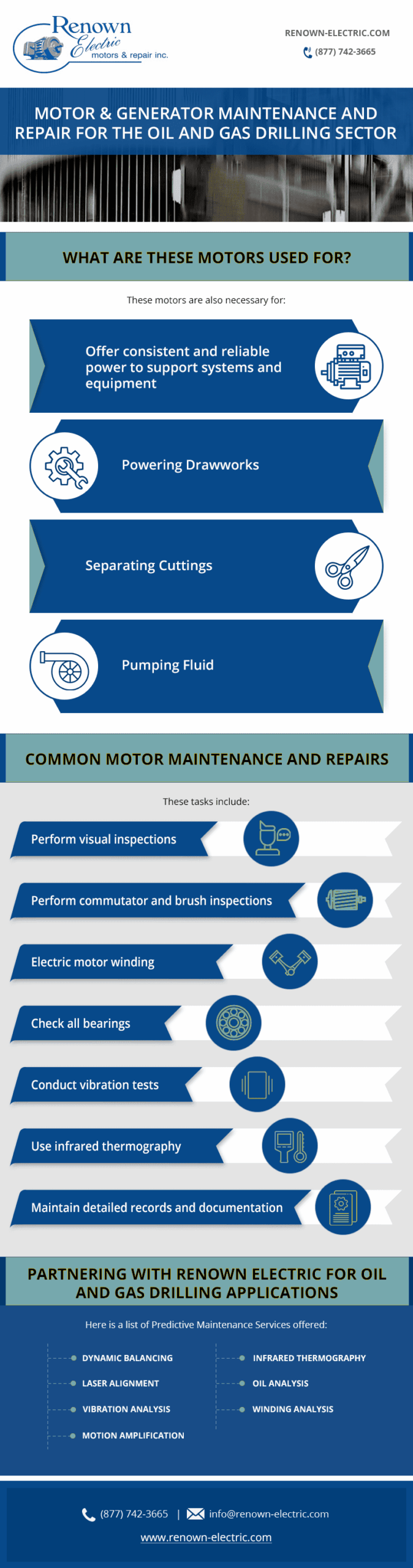 Since electric motors and generators are crucial for the oil and gas drilling industry, it is essential to maintain a preventative maintenance plan to ensure optimal efficiency and safety of the equipment. Proper maintenance boosts equipment lifespan and significantly reduces the risk of premature equipment failure which can lead to costly downtime. Equipment used for this industry is exposed to conditions such as consistent vibrations, extreme temperatures, and corrosive substances, further necessitating regular maintenance and repairs.