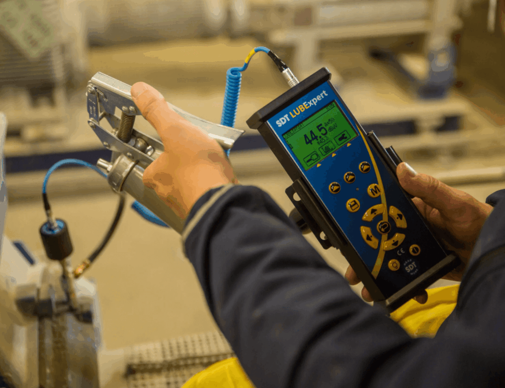 The core of our precision service lies in acoustic monitoring. Ultrasound equipment acts as a highly sensitive stethoscope, allowing our certified technicians to “hear” the high-frequency sounds of friction within a running bearing. Every bearing establishes a healthy baseline decibel (dB) level. As grease degrades or is depleted, friction increases, causing the dB level to rise significantly. We don’t guess the amount of grease—we meter it while monitoring the dB level in real-time. The lubrication process is immediately stopped the moment the reading drops back to its established healthy baseline, ensuring the bearing is perfectly charged without the detrimental effects of over-pressurization.