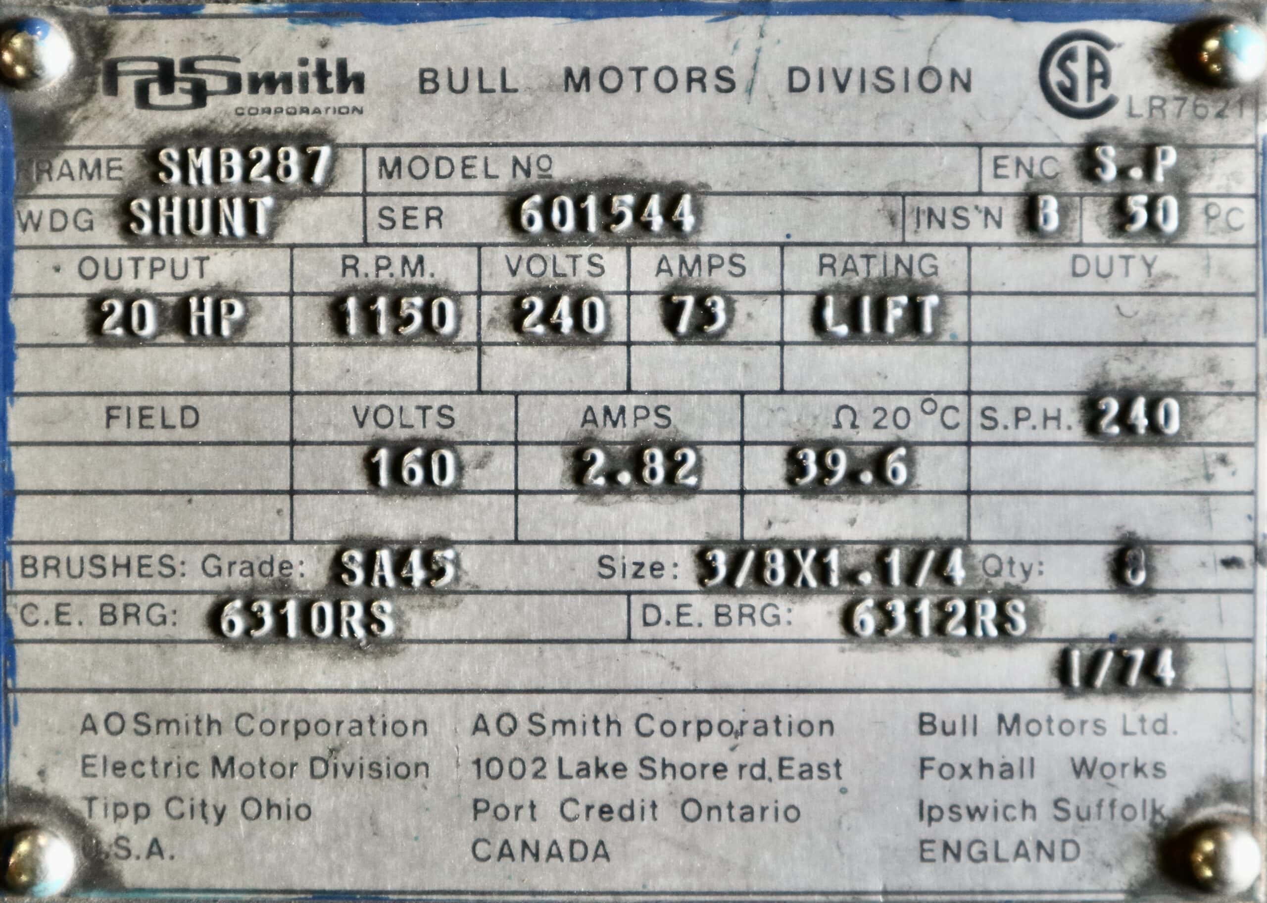AO Smith/Bull DC Motor 20HP 1150RPM 287SMB #234