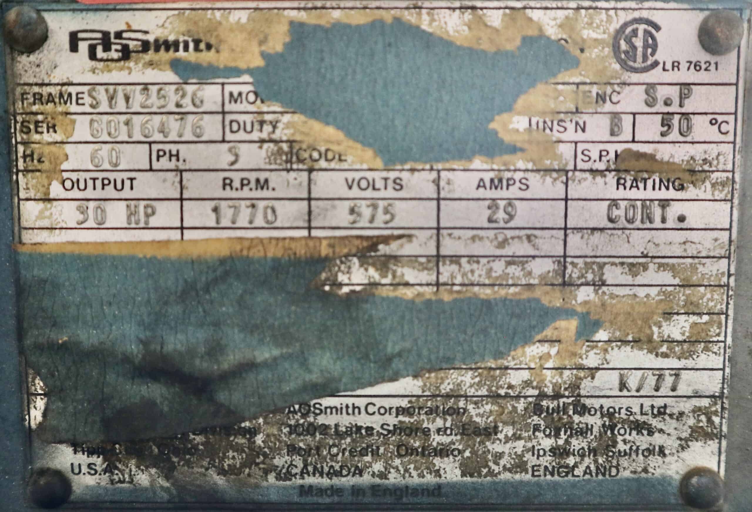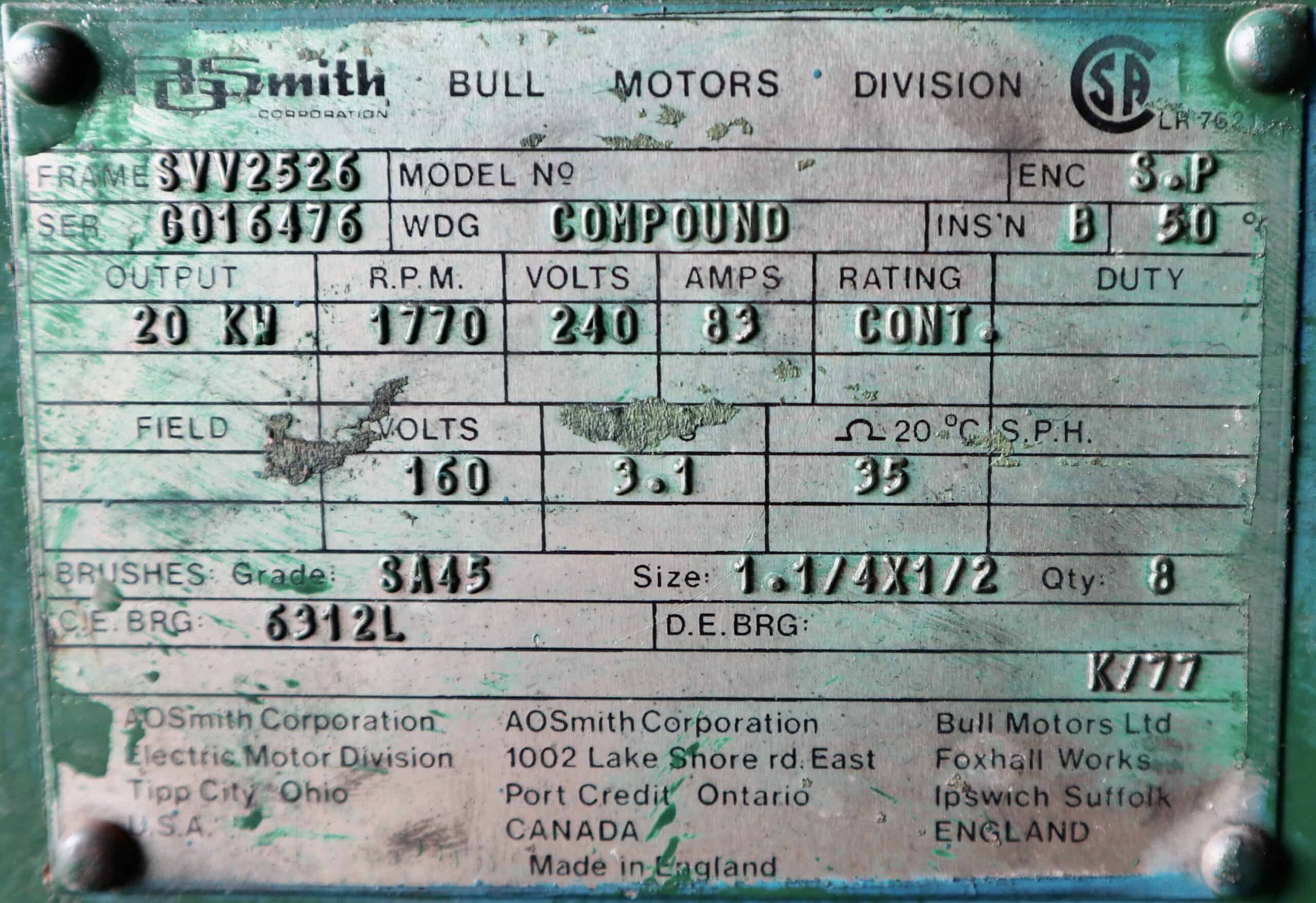 AO Smith/Bull Generator 30HP 20KW 1770RPM SVV2526 #325
