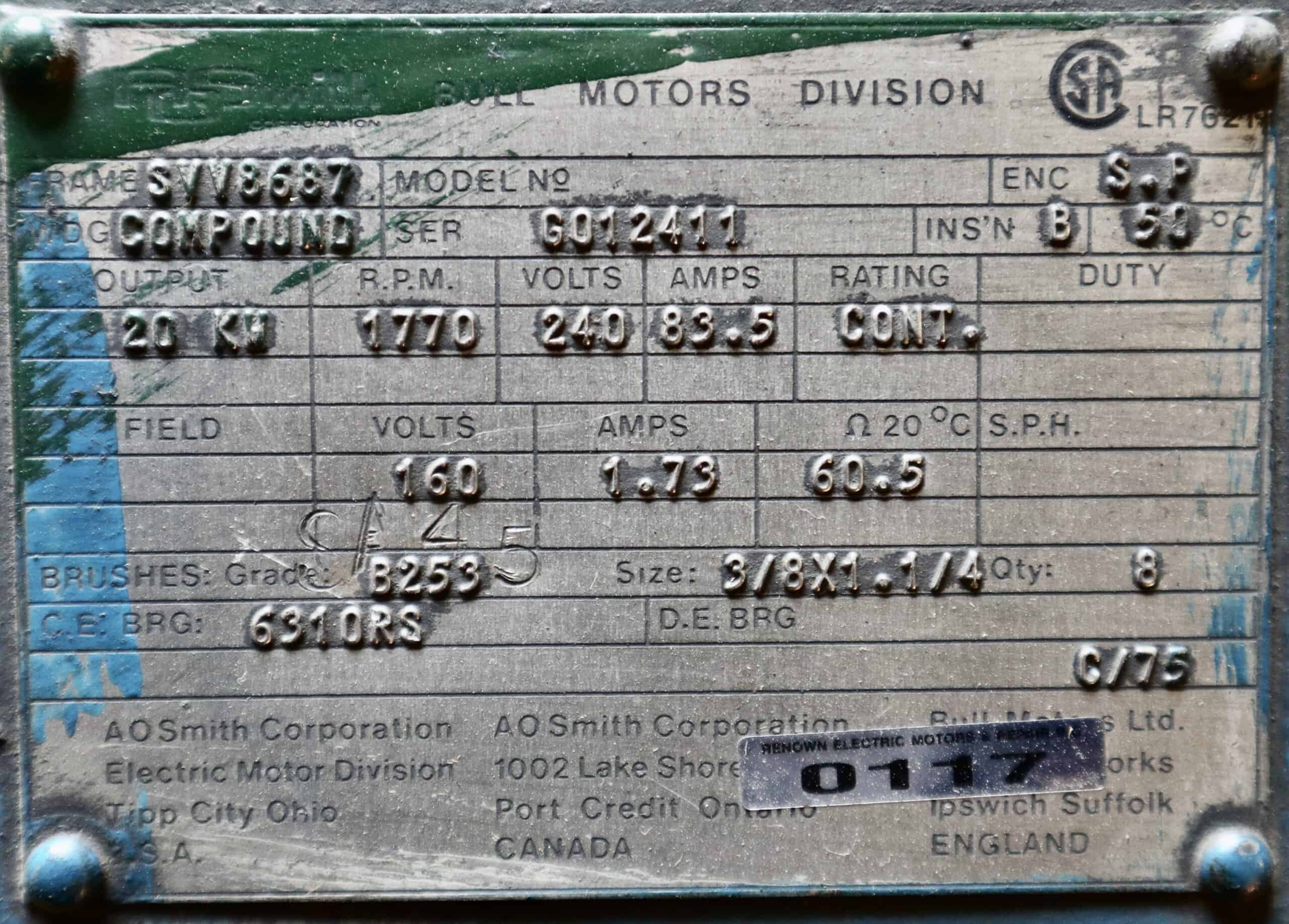 Item # 0117 — AO Smith/Bull Generator 30HP 20KW 1770RPM SVV8687 #0117