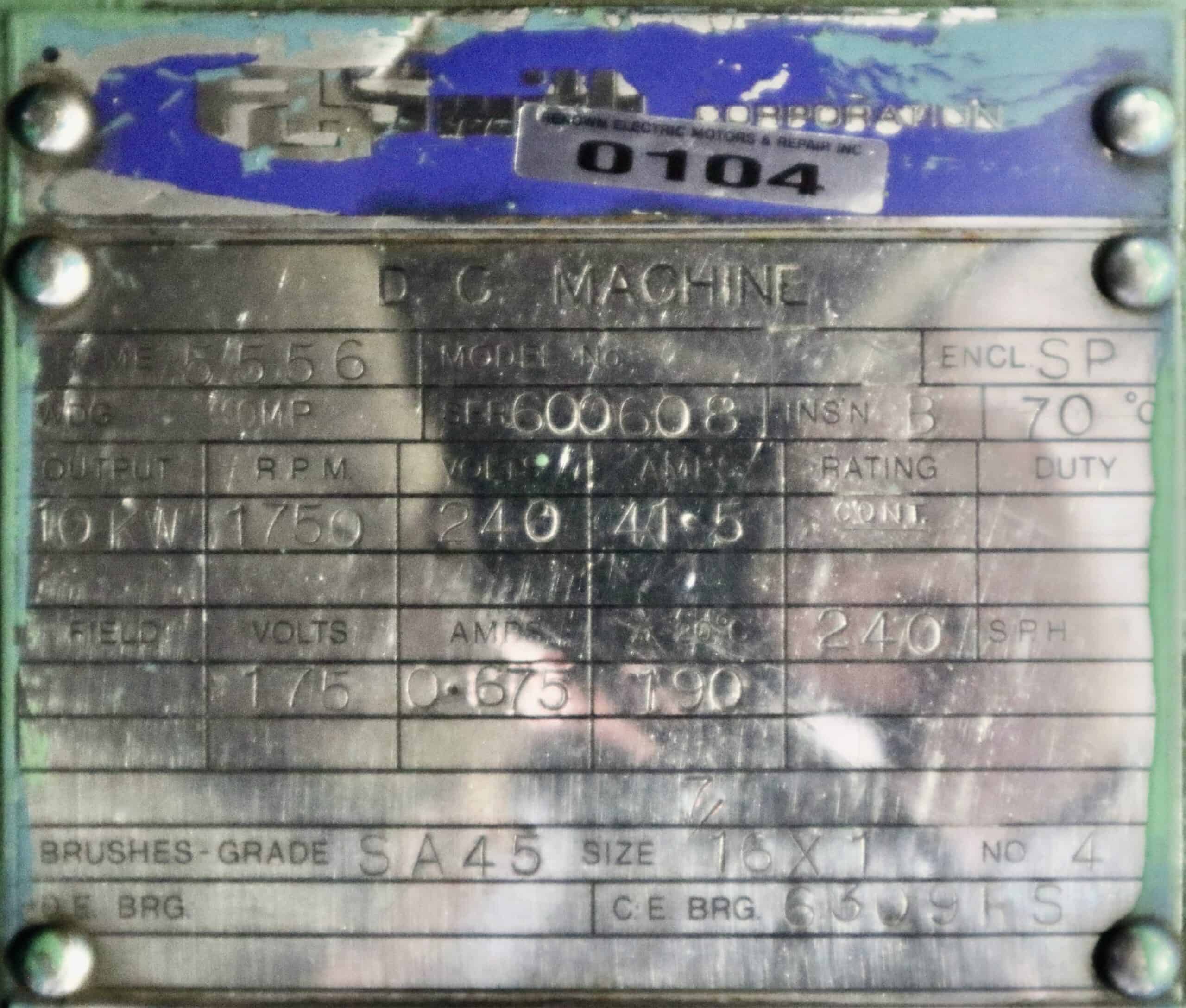 Item # 0104 — AO Smith Generator 15 HP 10KW 1750RPM 5556 #0104