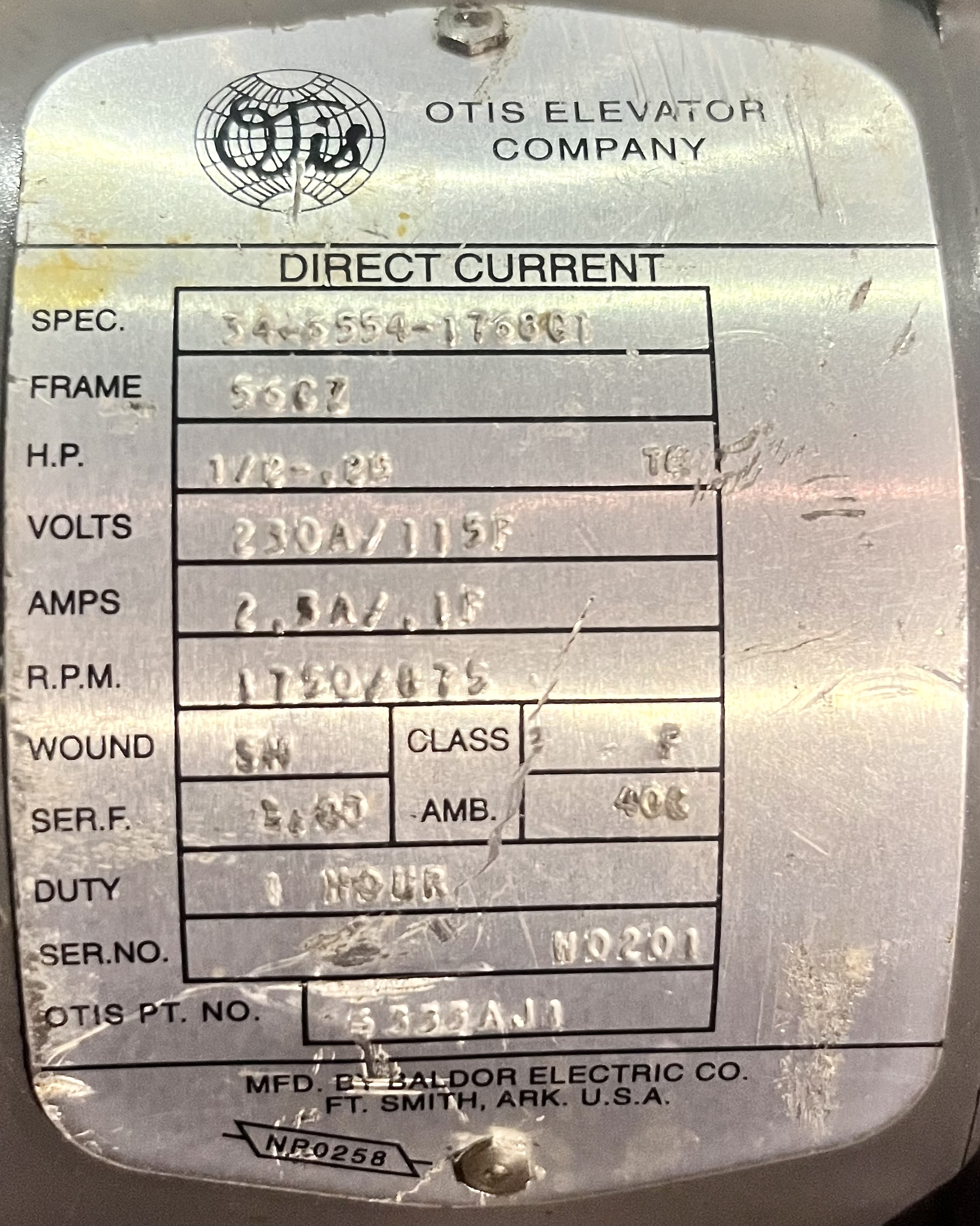 Item # 1052 — Baldor Otis DC Door Motor 1/2HP 1750/875RPM 56CZ #1052