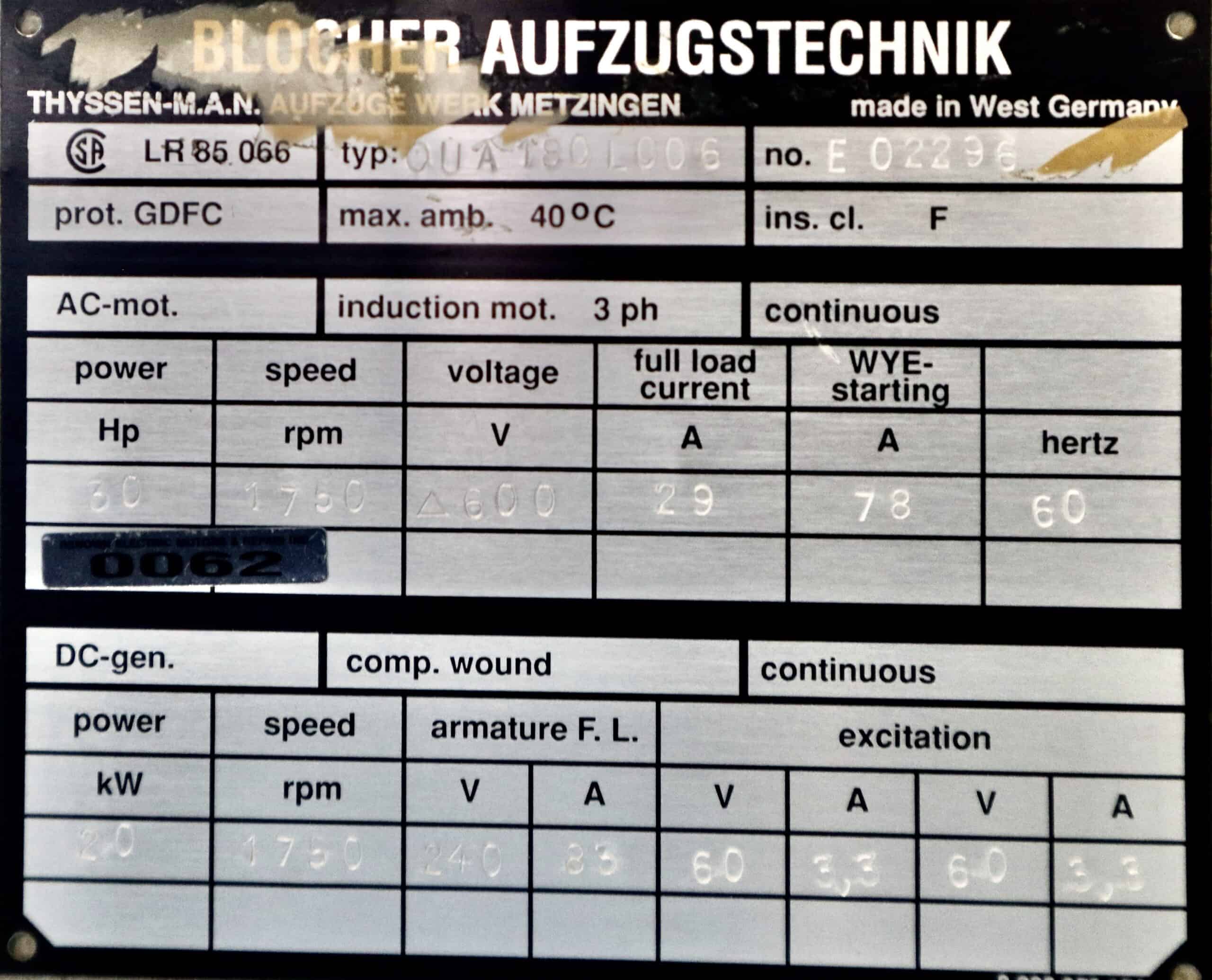 Blocher Generator 30HP 20KW 1750RPM OUA180L006 #0062