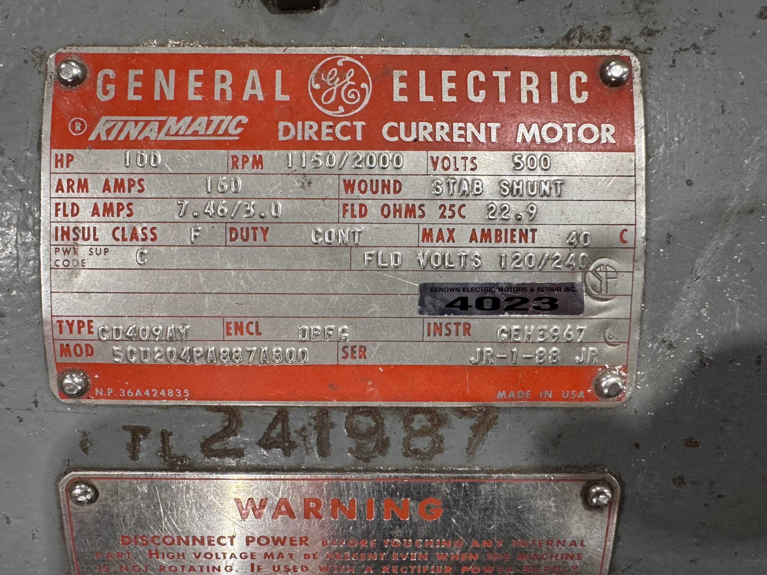 Item # 4023 — General Electric DC 100HP 1150/2000 #4023