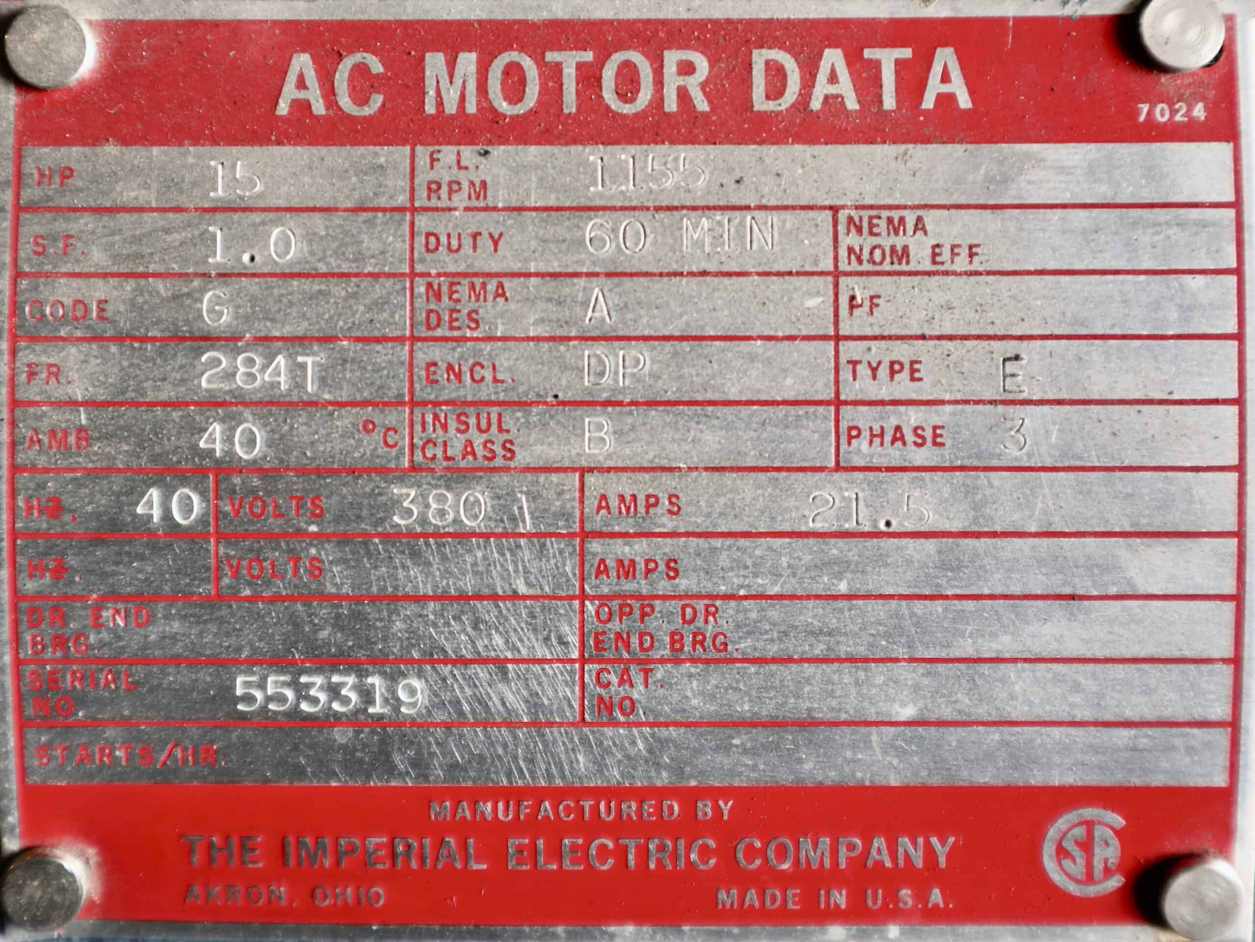 Item # P.O.161 — Imperial Electric AC Motor 15HP 1155RPM 284T #161
