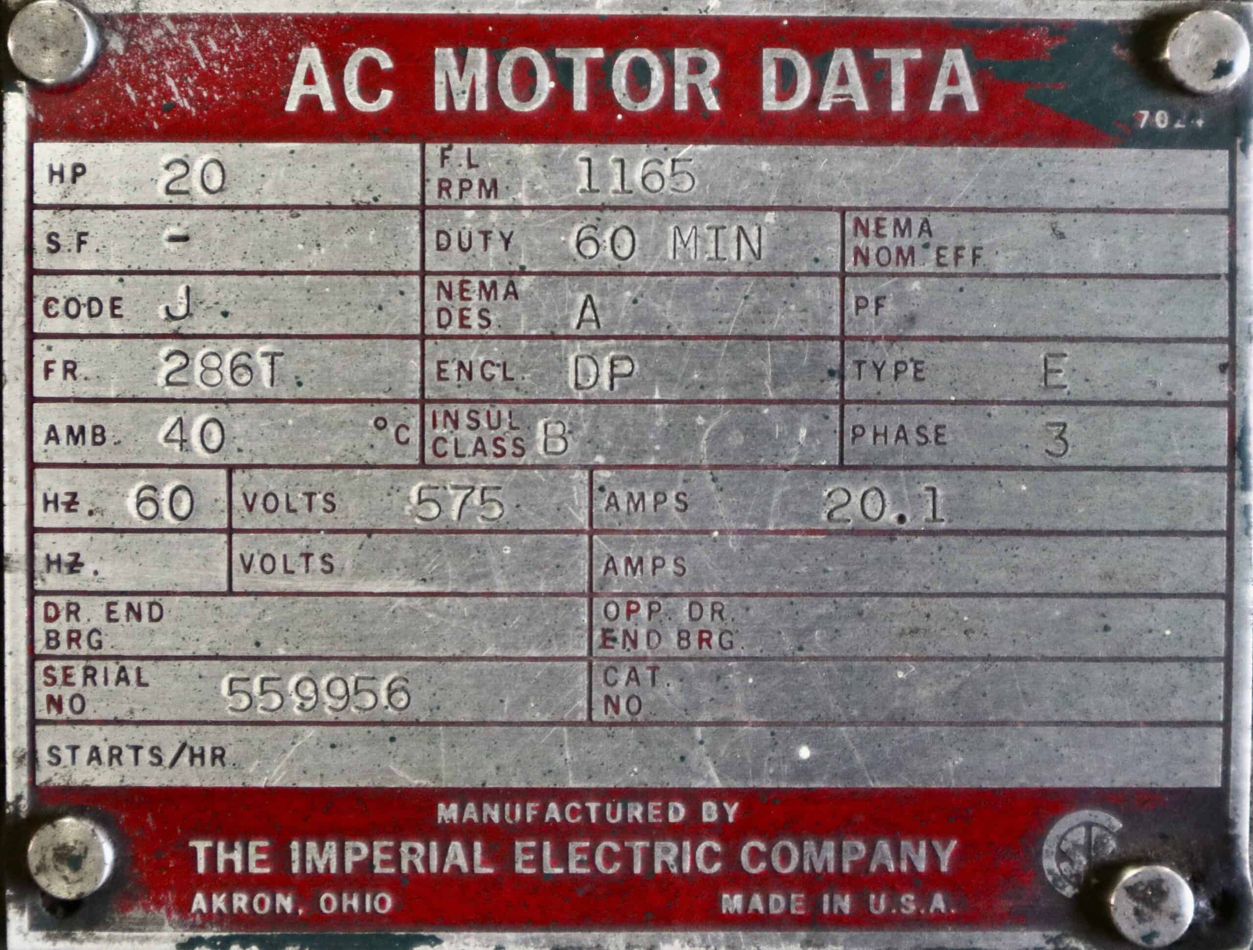 Item # P.O.166 — Imperial Electric AC Motor 20HP 1165RPM 286T #166