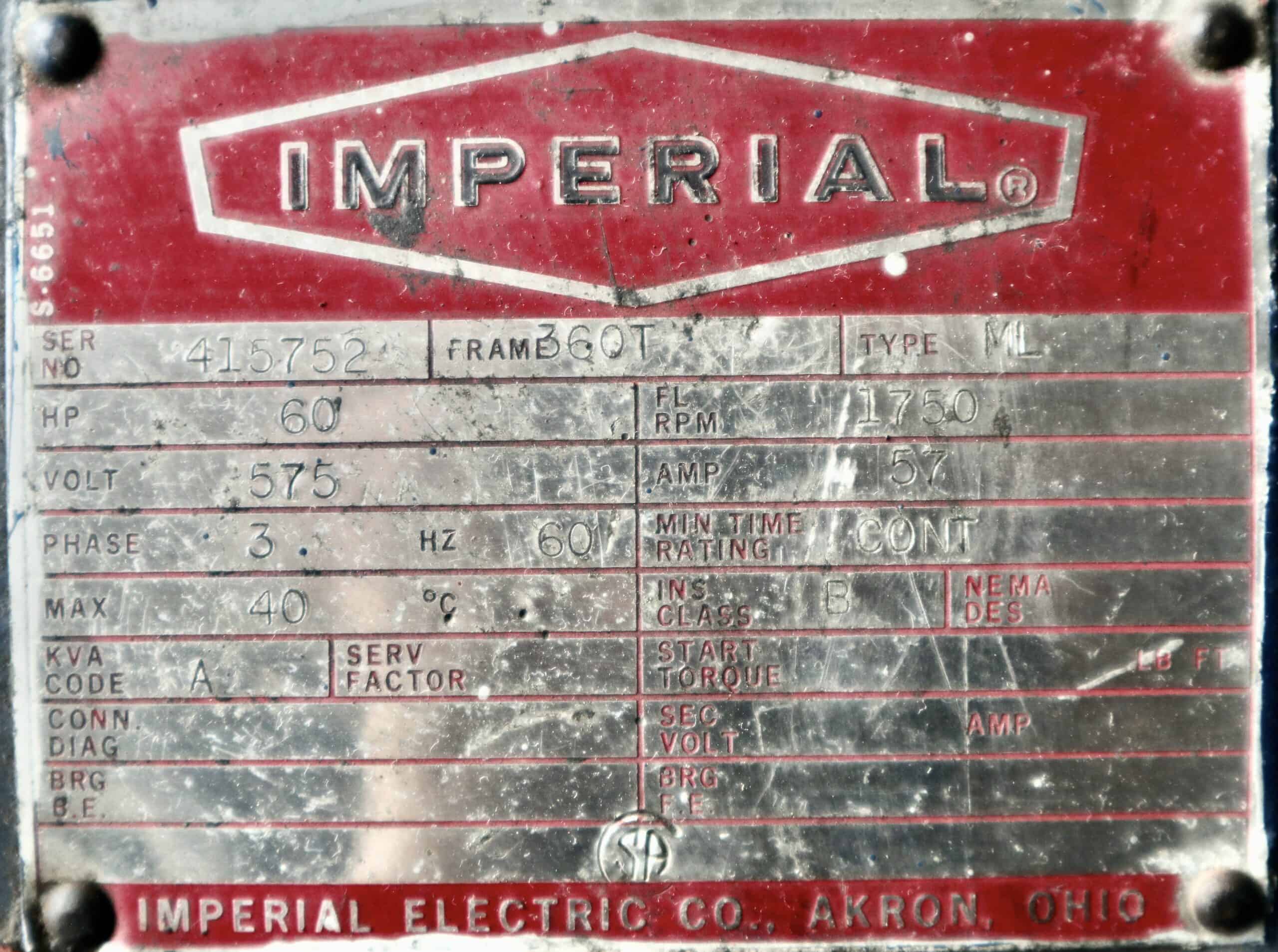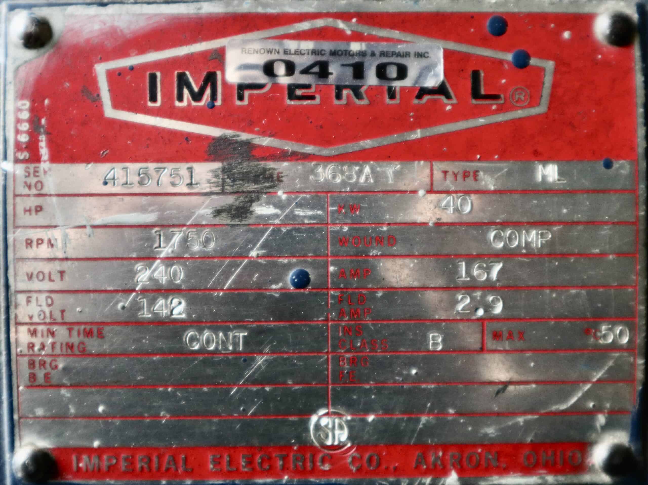 Imperial Electric Generator 60HP 40KW 1750RPM 360T/368A #0410