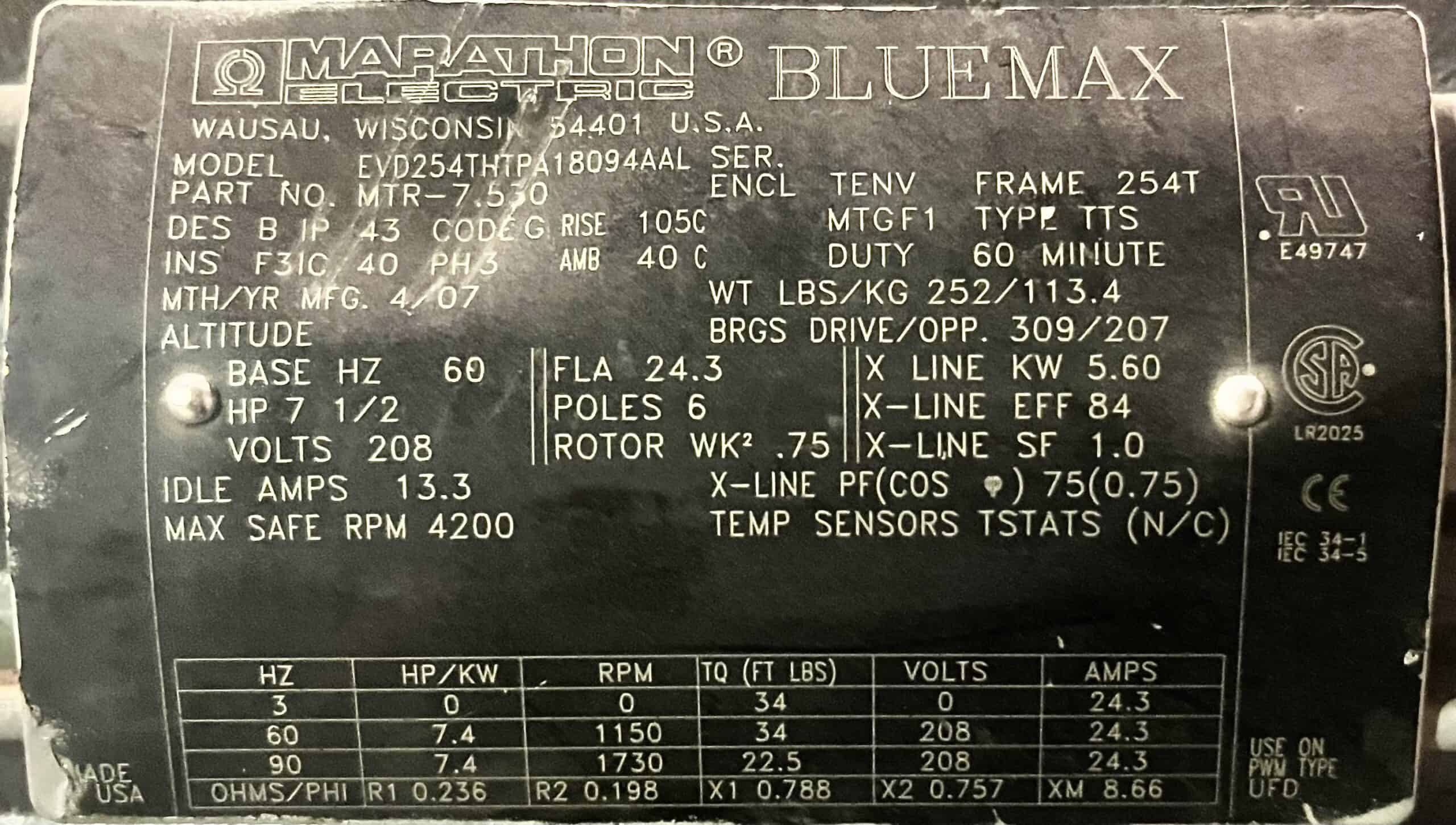 Item # P.O.293 — Marathon 7.5HP 1150RPM 254T AC Motor #293