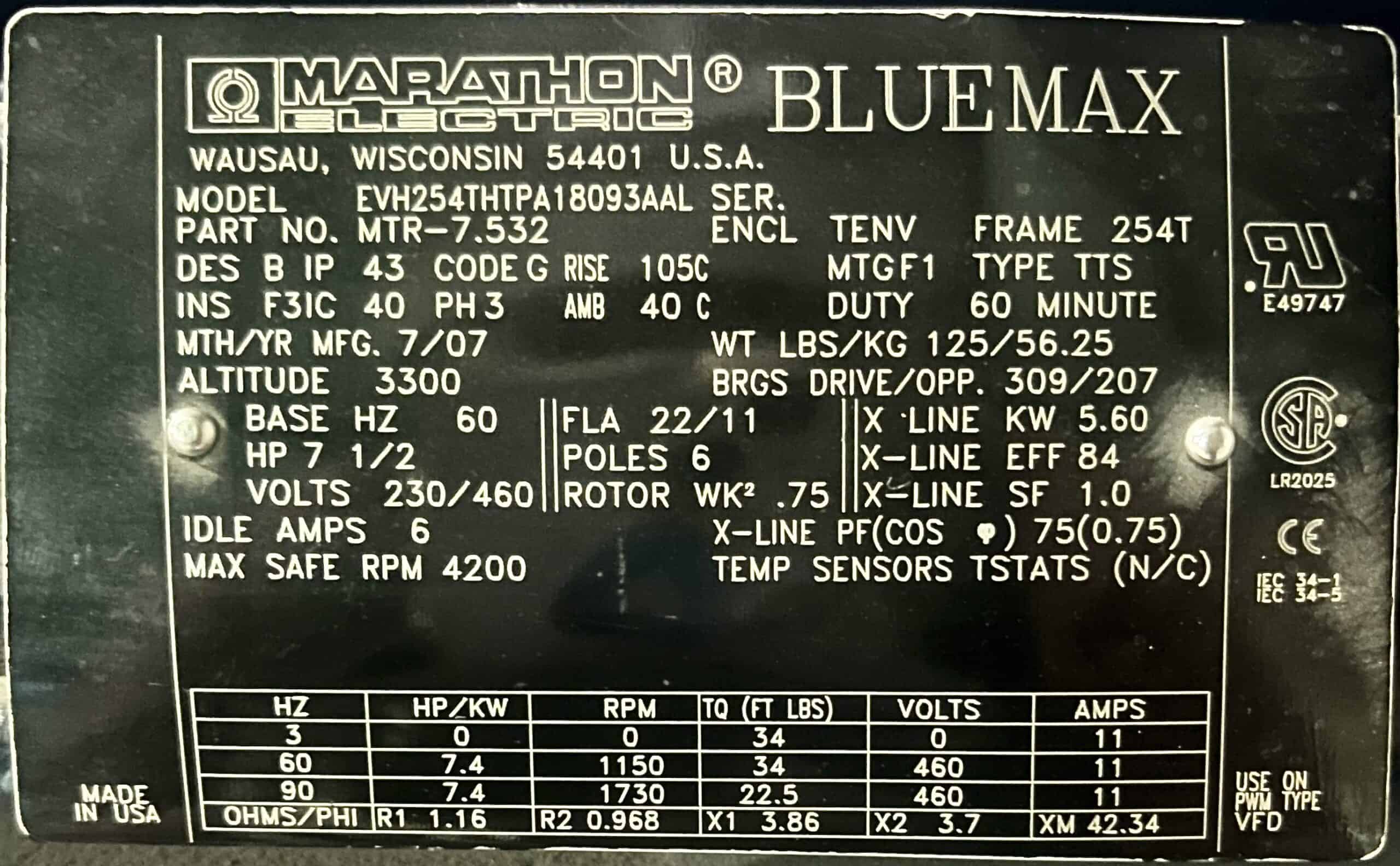 Marathon 7.5HP 4200RPM 254T AC Motor #294