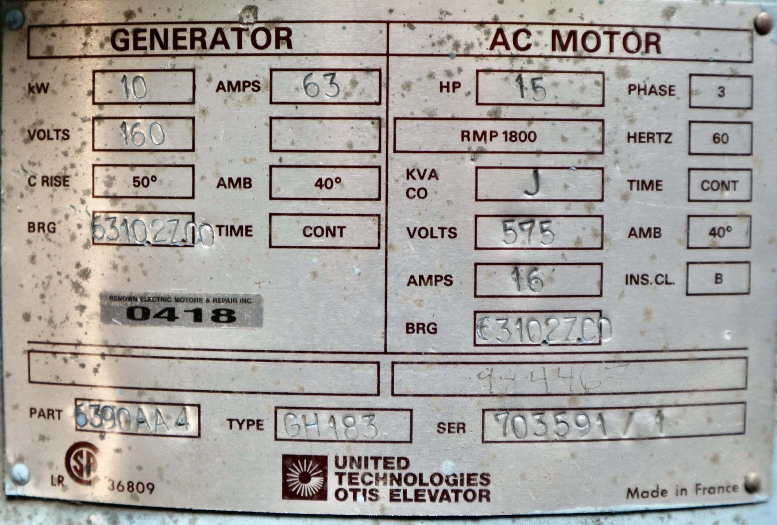 Otis Generator 15HP 10KW 1800RPM GH183 #0418
