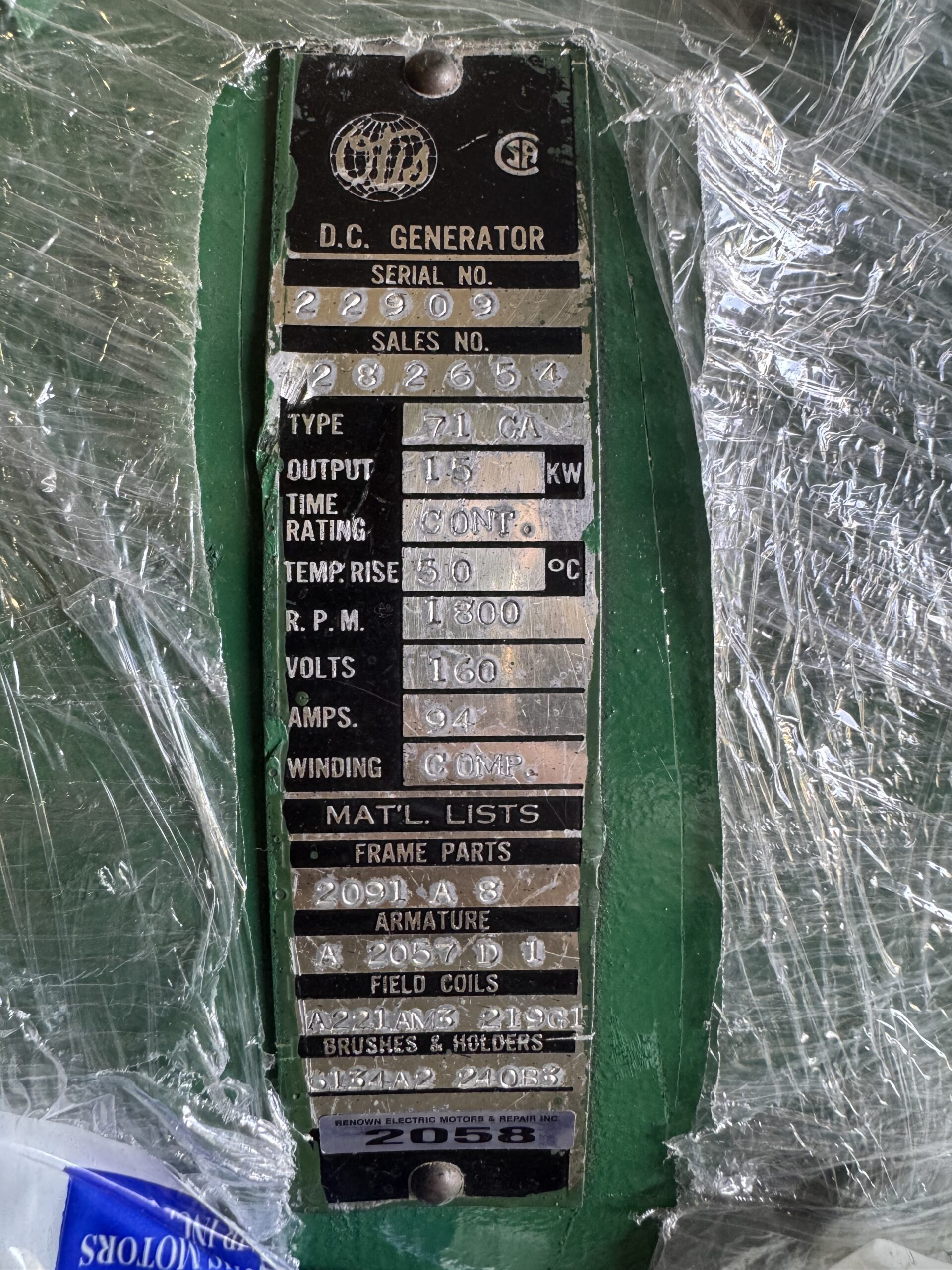 Otis Generator 23HP 15KW 1800RPM 74ES/71GA #2058