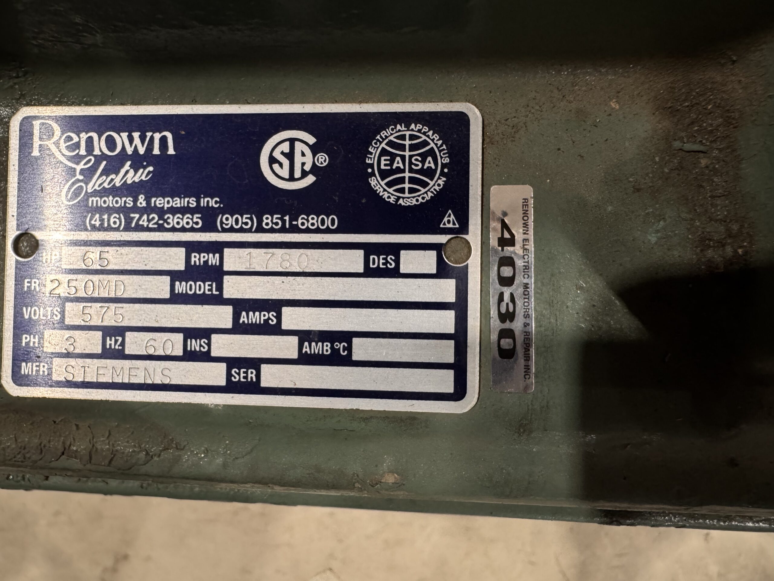 Item # 4030 — Siemens AC Industrial 65HP 1780RPM 575V 250MD #4030