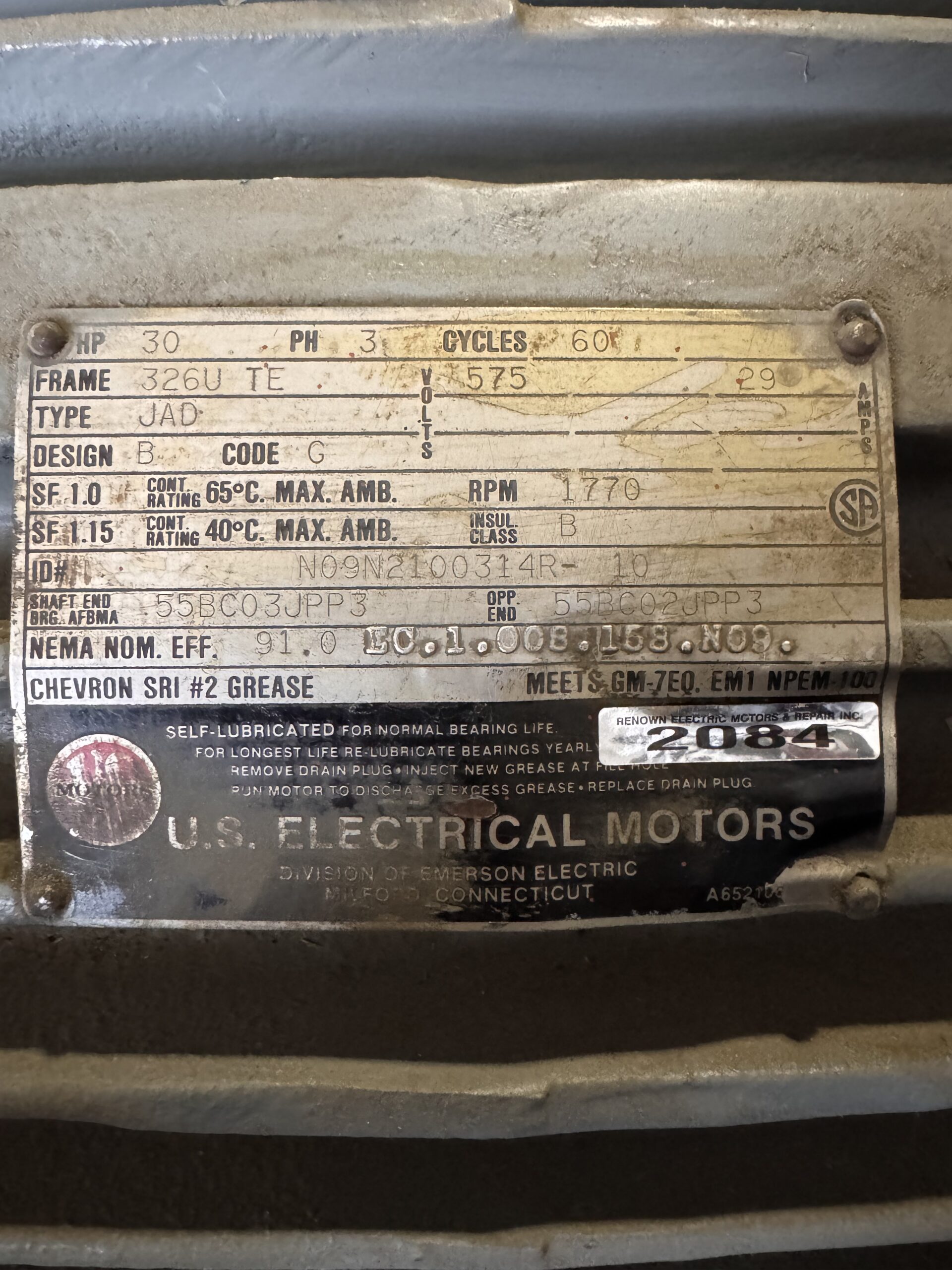 Item # 2084 — US Motors AC Industrial 30HP 1770RPM 575V 29A 326U TE #2084
